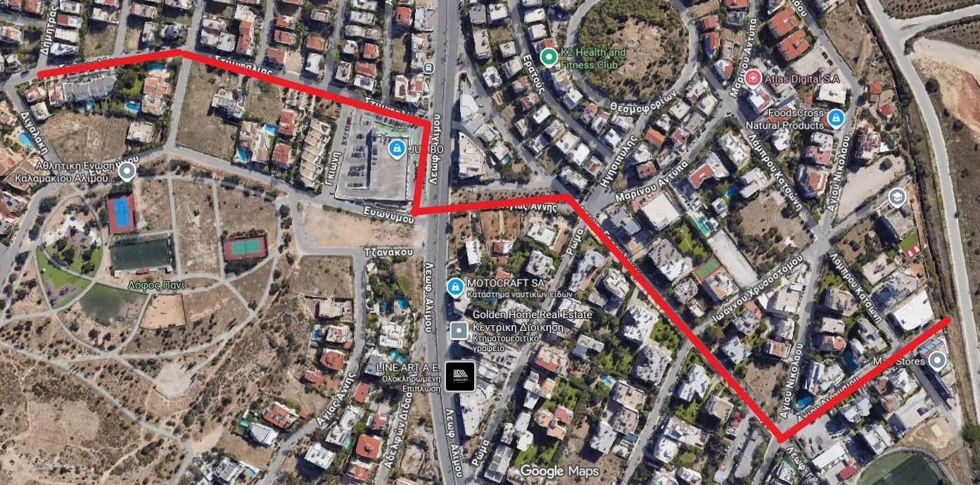 Στη φωτογραφία απεικονίζεται με κόκκινο χρώμα η διαδρομή του αγωγού, από την οδό Δήμητρας μέχρι το ρέμα Τραχώνων.