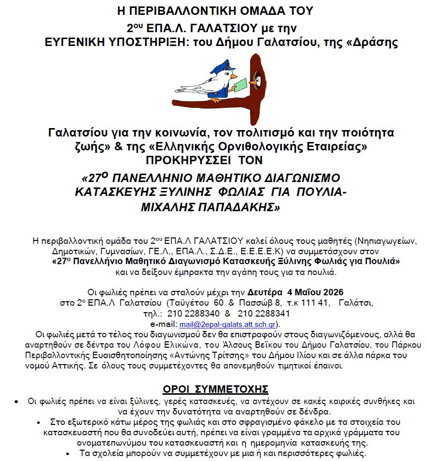 Η περιβαλλοντική ομάδα του 2ου ΕΠΑ.Λ. Γαλατσίου, με την υποστήριξη του Δήμου Γαλατσίου, της «Δράσης Γαλατσίου για την κοινωνία, τον πολιτισμό και την ποιότητα ζωής» και της Ελληνικής Ορνιθολογικής Εταιρείας, διοργανώνει τον «27ο Πανελλήνιο Μαθητικό Διαγωνισμό κατασκευής Ξύλινης Φωλιάς για Πουλιά – Μιχάλης Παπαδάκης», για το σχολικό έτος 2025-2026.