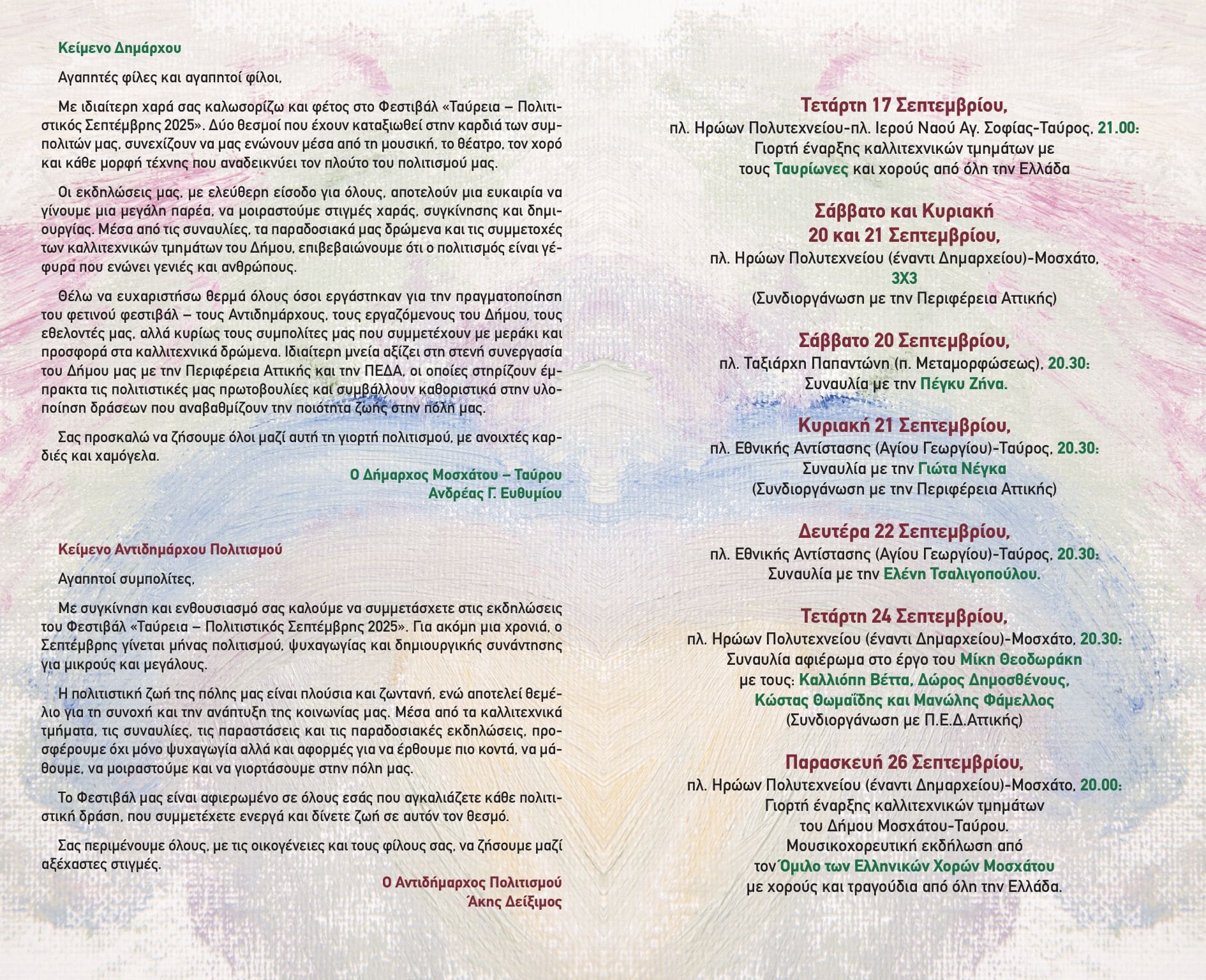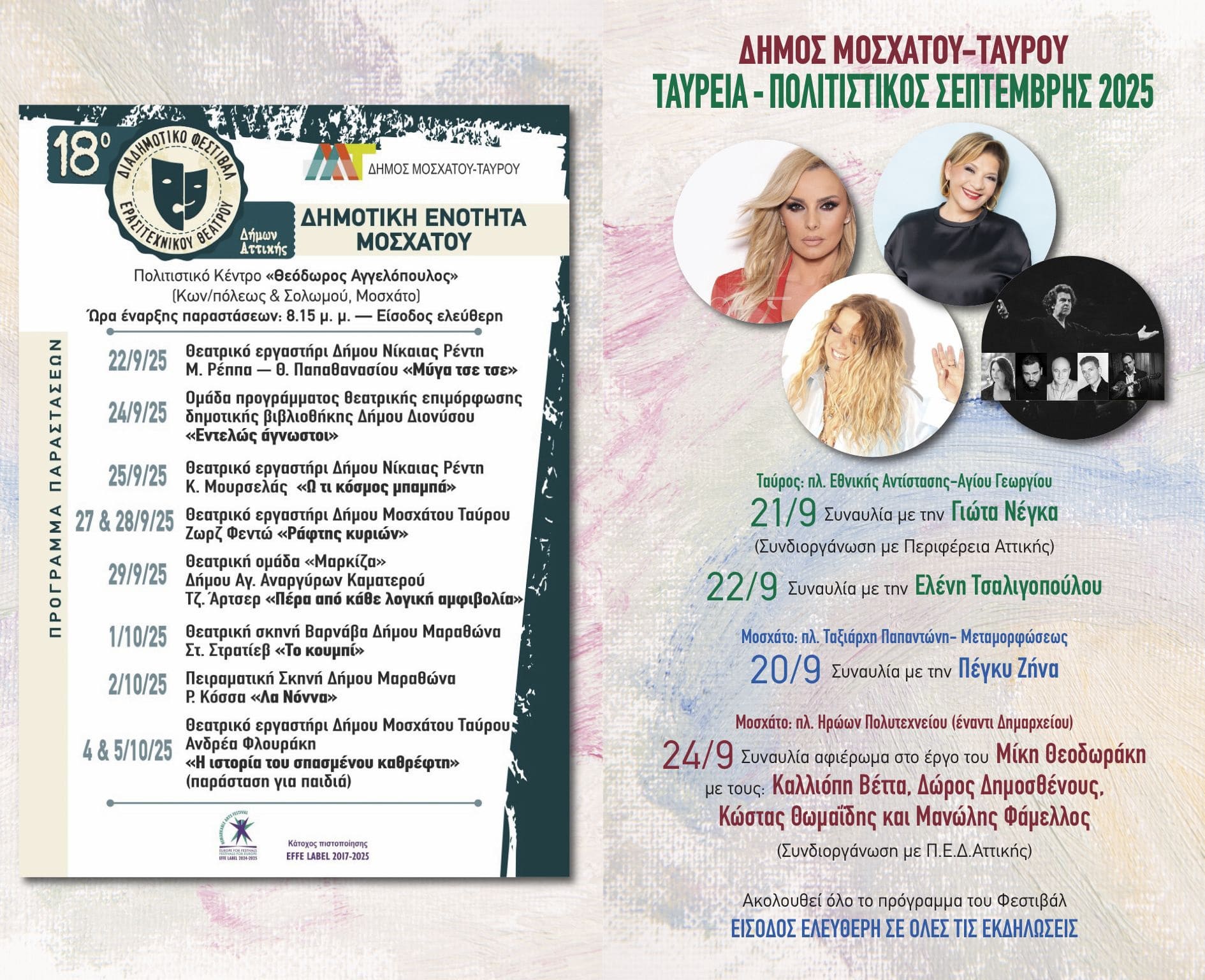 Το πρόγραμμα όλων των εκδηλώσεων έχει αναρτηθεί στη σελίδα του Δήμου Μοσχάτου-Ταύρου: www.dimosmoschatou-tavrou.gr. Όλες οι εκδηλώσεις είναι με ελεύθερη είσοδο.