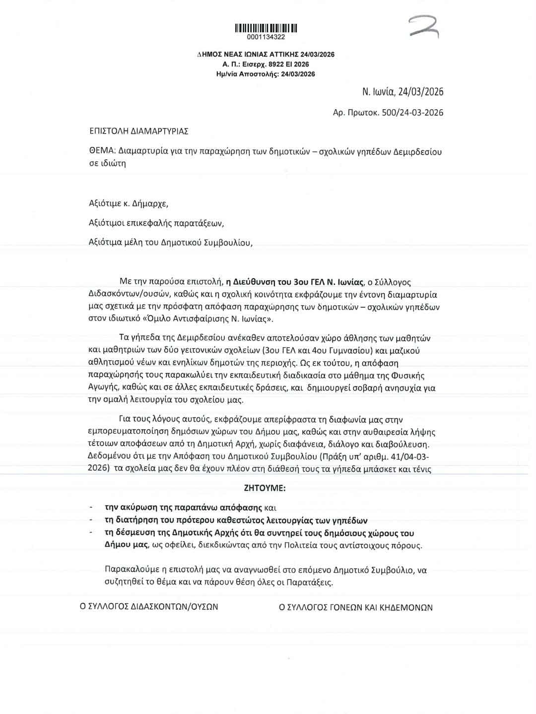 Στον αντίποδα, η Διεύθυνση του 3ου ΓΕΛ Νέας Ιωνίας, μαζί με τον Σύλλογο Διδασκόντων και τον Σύλλογο Γονέων, εκφράζουν έντονη διαμαρτυρία, τονίζοντας ότι τα γήπεδα δεν αποτελούν απλώς έναν δημοτικό χώρο, αλλά βασικό σημείο άθλησης για τους μαθητές των κοντινών σχολείων.