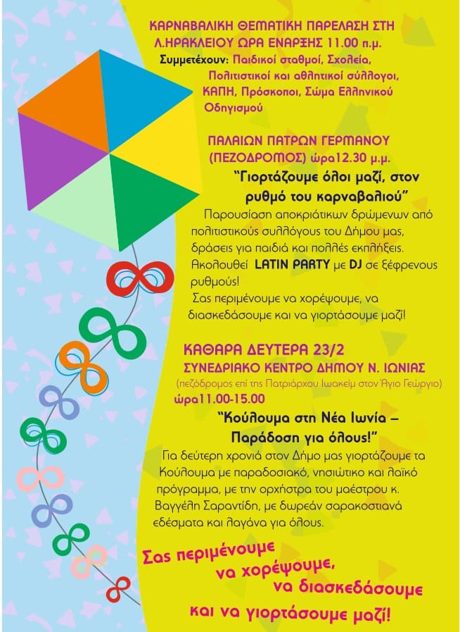 Η Νέα Ιωνία φορά τα αποκριάτικά της και σας περιμένει στο Καρναβάλι την Κυριακή 15 Φεβρουαρίου και στα Κούλουμα!