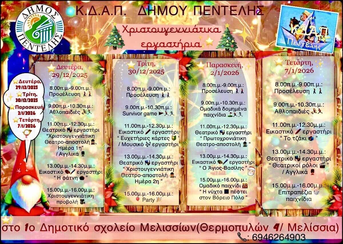 Με γνώμονα τη στήριξη οικογένειας και των εργαζόμενων γονέων, ο Δήμος Πεντέλης διοργανώνει δωρεάν χριστουγεννιάτικα εργαστήρια για παιδιά, κατά το χρονικό εορταστικό διάστημα που τα σχολεία είναι κλειστά, στο Κέντρο Δημιουργικής Απασχόλησης Παιδιών – Κ.Δ.Α.Π (ΘΕΡΜΟΠΥΛΩΝ 4, 1ο ΔΗΜΟΤΙΚΟ ΜΕΛΙΣΣΙΩΝ)