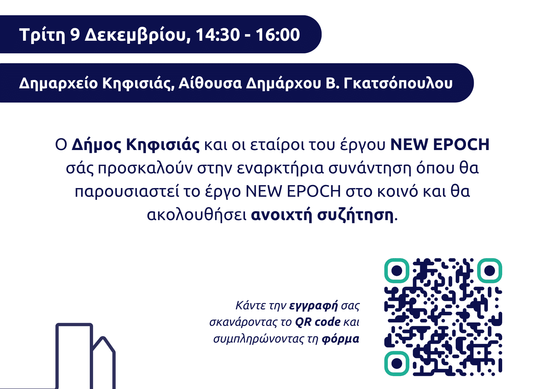 Η εναρκτήρια συνάντηση του ευρωπαϊκού έργου NEW EPOCH θα παρουσιαστεί στο κοινό την Τρίτη 9 Δεκεμβρίου, ώρα 14:30 – 16:00, στην Αίθουσα “Δημάρχου Β. Γκατσόπουλου” στο Δημαρχείο Κηφισιάς και θα ακολουθήσει ανοιχτή συζήτηση.