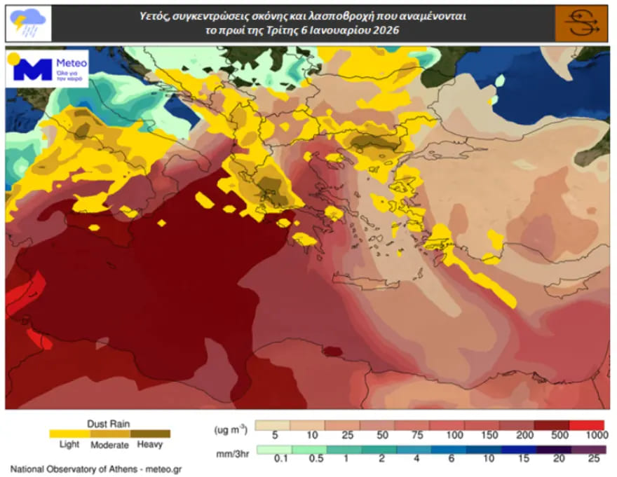 Σύμφωνα με τα τελευταία προγνωστικά δεδομένα του, λασποβροχές κατά τόπους αναμένονται έως τις πρώτες ώρες της Τετάρτης 08/01, κυρίως στα δυτικά και βόρεια καθώς και στο Βορειοανατολικό Αιγαίο. Στη συνέχεια λασποβροχές θα εκδηλωθούν κατά τόπους και στα υπόλοιπα τμήματα της χώρας. Από το πρωί της Πέμπτης 08/01 οι λασποβροχές θα περιοριστούν στο Νότιο και Ανατολικό Αιγαίο και στην Κρήτη και έως το βράδυ θα σταματήσουν.