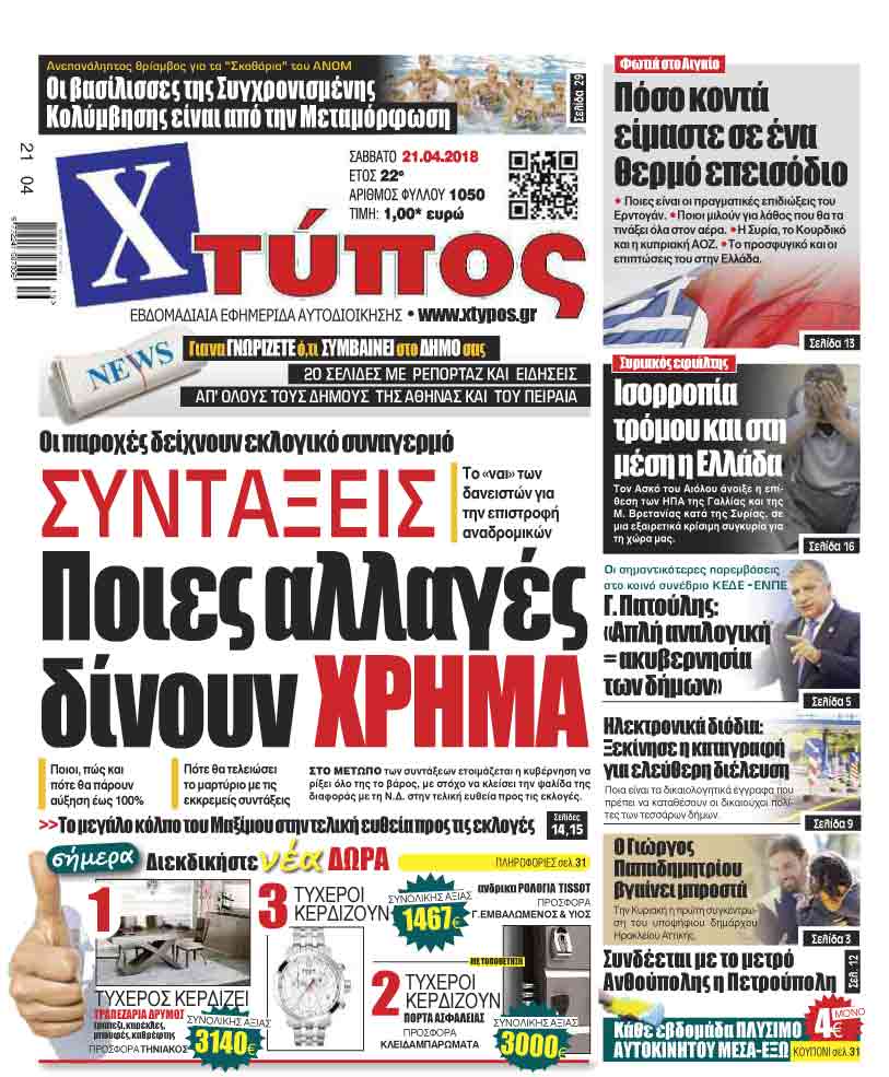 Πρωτοσέλιδο «ΧΤΥΠΟΣ» Σαββάτου 21 Απριλίου 2018
