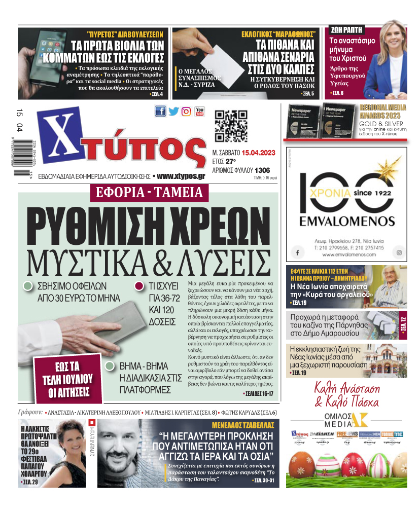 “Πρωτοσέλιδο της εφημερίδας «ΧΤΥΠΟΣ» Σάββατο 15 Απριλίου 2023”