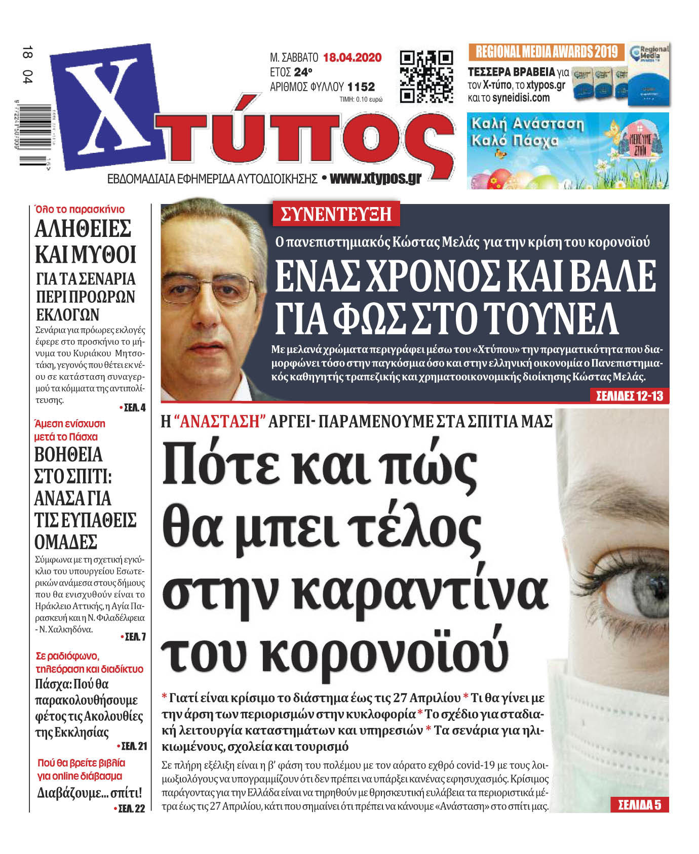 Πρωτοσέλιδο «ΧΤΥΠΟΣ» Σάββατο 18 Απριλίου 2020