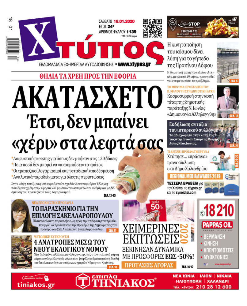 Πρωτοσέλιδο «ΧΤΥΠΟΣ» Σάββατο 18 Ιανουαρίου 2020