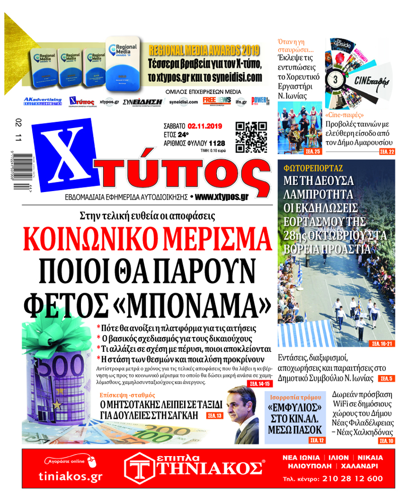 Πρωτοσέλιδο «ΧΤΥΠΟΣ» Σάββατο 2 Νοεμβρίου 2019