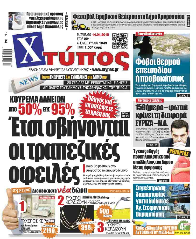 Πρωτοσέλιδο «ΧΤΥΠΟΣ» Σαββάτου 14 Απριλίου 2018