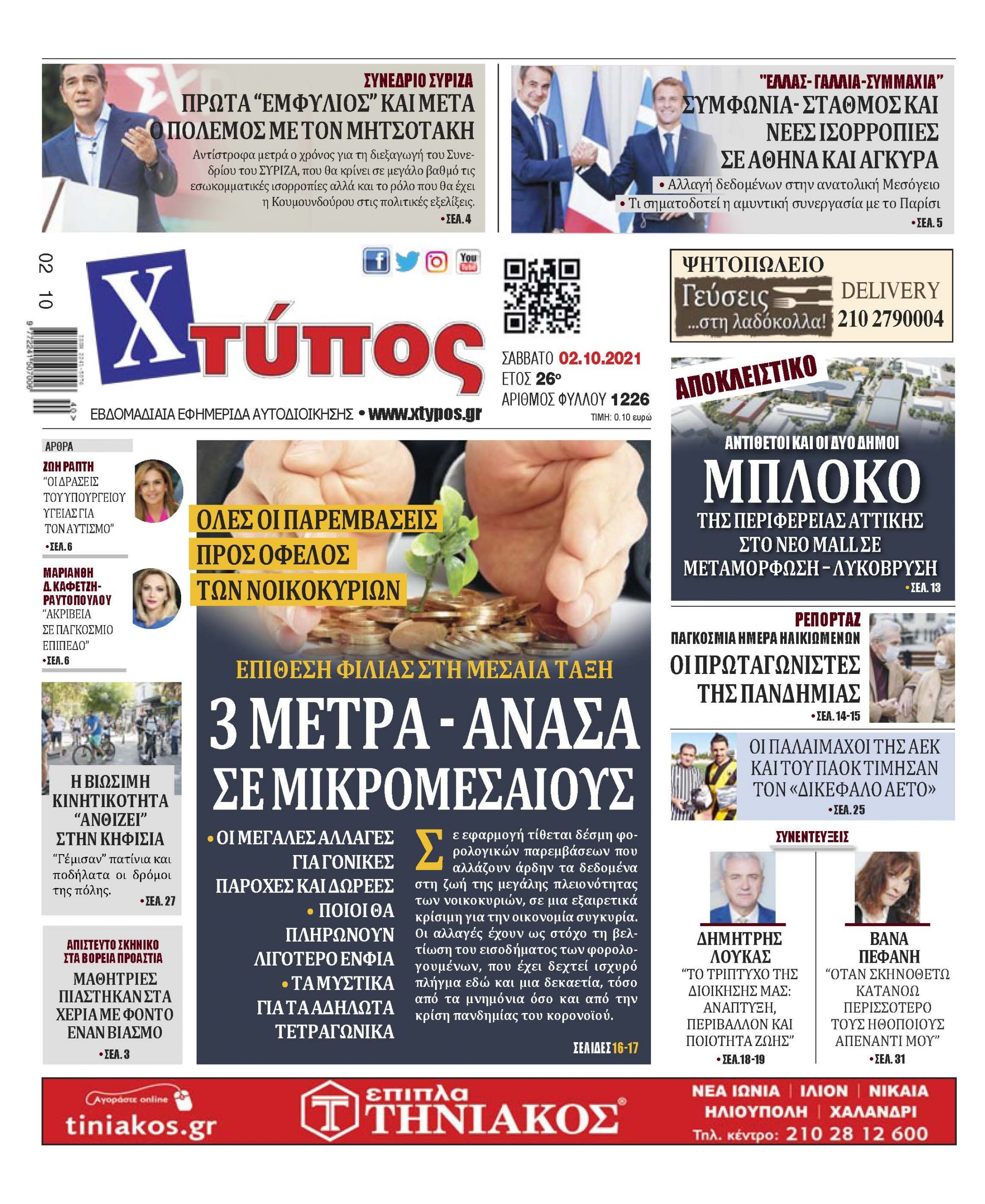 Πρωτοσέλιδο εφημερίδας «ΧΤΥΠΟΣ» Σάββατο 02 Οκτωβρίου 2021”