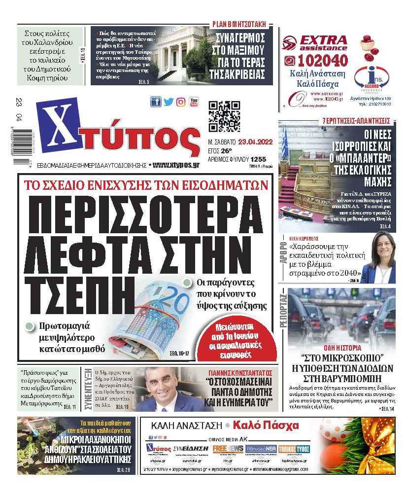 “Πρωτοσέλιδο εφημερίδας «ΧΤΥΠΟΣ» Σάββατο 23 Απριλίου 2022”