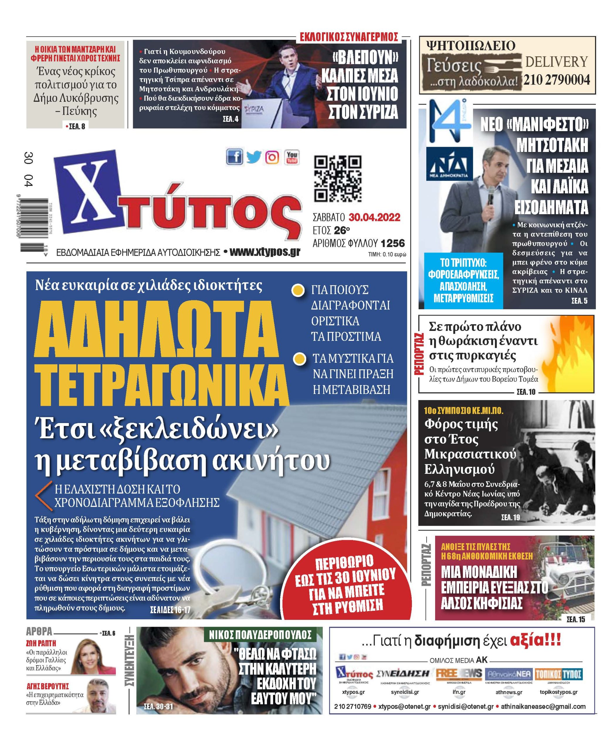 “Πρωτοσέλιδο εφημερίδας «ΧΤΥΠΟΣ» Σάββατο 30 Απριλίου 2022”