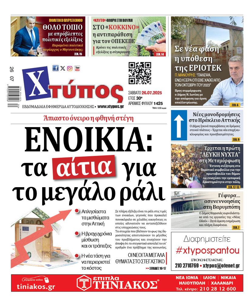 “Πρωτοσέλιδο της εφημερίδας «ΧΤΥΠΟΣ» Σάββατο 26 Ιουλίου 2025”