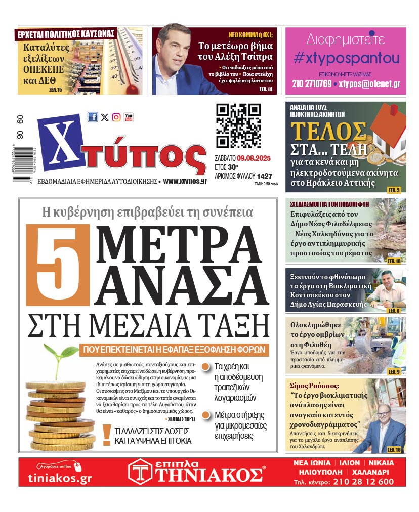 “Πρωτοσέλιδο της εφημερίδας «ΧΤΥΠΟΣ» Σάββατο 9 Αυγούστου 2025”