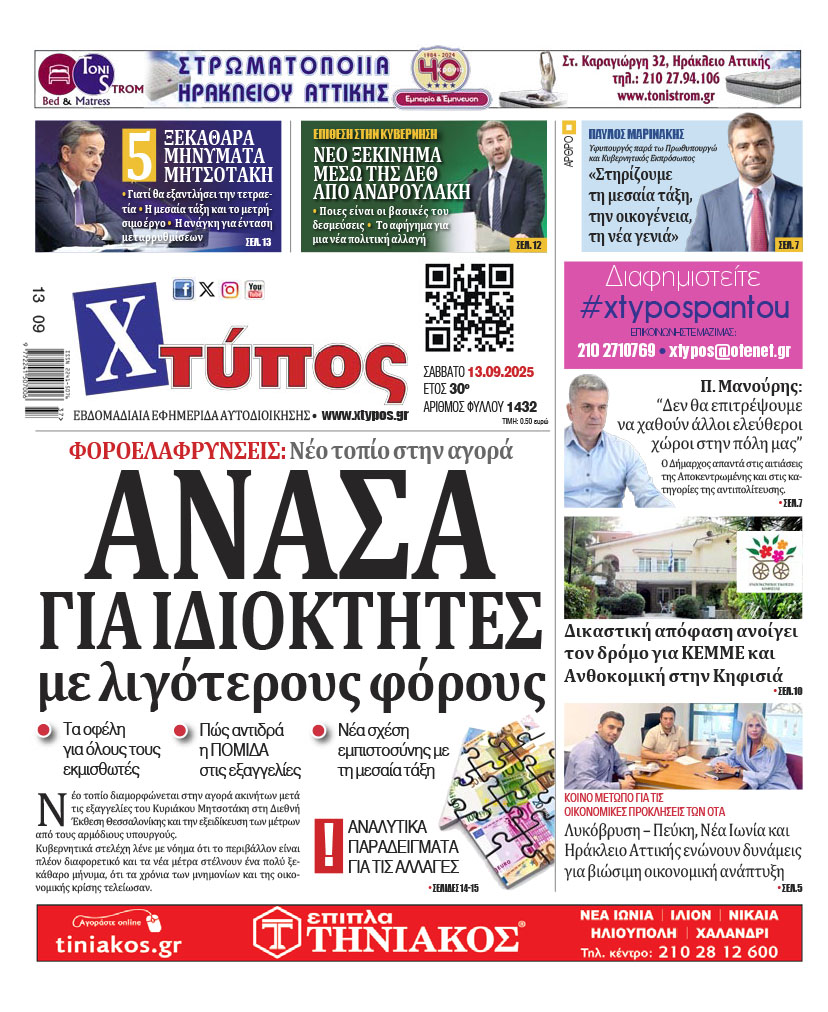 “Πρωτοσέλιδο της εφημερίδας «ΧΤΥΠΟΣ» Σάββατο 13 Σεπτεμβρίου 2025”