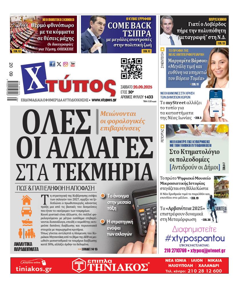 “Πρωτοσέλιδο της εφημερίδας «ΧΤΥΠΟΣ» Σάββατο 20 Σεπτεμβρίου 2025”