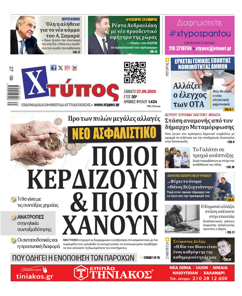 “Πρωτοσέλιδο της εφημερίδας «ΧΤΥΠΟΣ» Σάββατο 27 Σεπτεμβρίου 2025”
