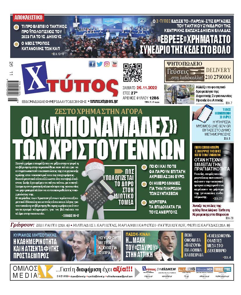 “Πρωτοσέλιδο εφημερίδας «ΧΤΥΠΟΣ» Σάββατο 26 Νοεμβρίου 2022”