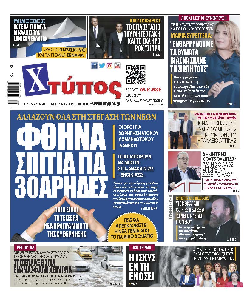 “Πρωτοσέλιδο εφημερίδας «ΧΤΥΠΟΣ» Σάββατο 03 Δεκεμβρίου 2022”