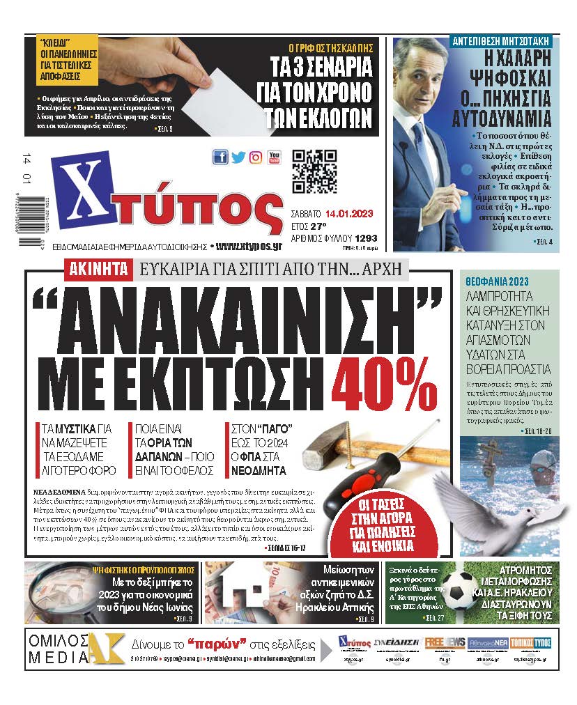 “Πρωτοσέλιδο της εφημερίδας «ΧΤΥΠΟΣ» Σάββατο 14 Ιανουαρίου 2023”