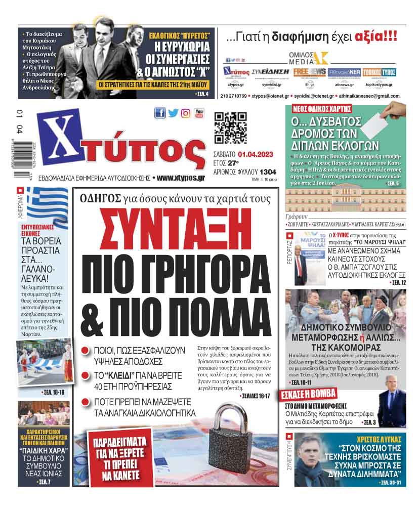 “Πρωτοσέλιδο της εφημερίδας «ΧΤΥΠΟΣ» Σάββατο 1 Απριλίου 2023”