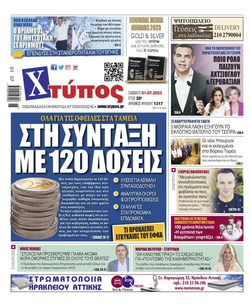 “Πρωτοσέλιδο της εφημερίδας «ΧΤΥΠΟΣ» Σάββατο 1 Ιουλίου 2023”