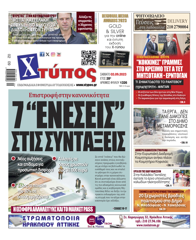 “Πρωτοσέλιδο της εφημερίδας «ΧΤΥΠΟΣ» Σάββατο 2 Σεπτεμβρίου 2023”