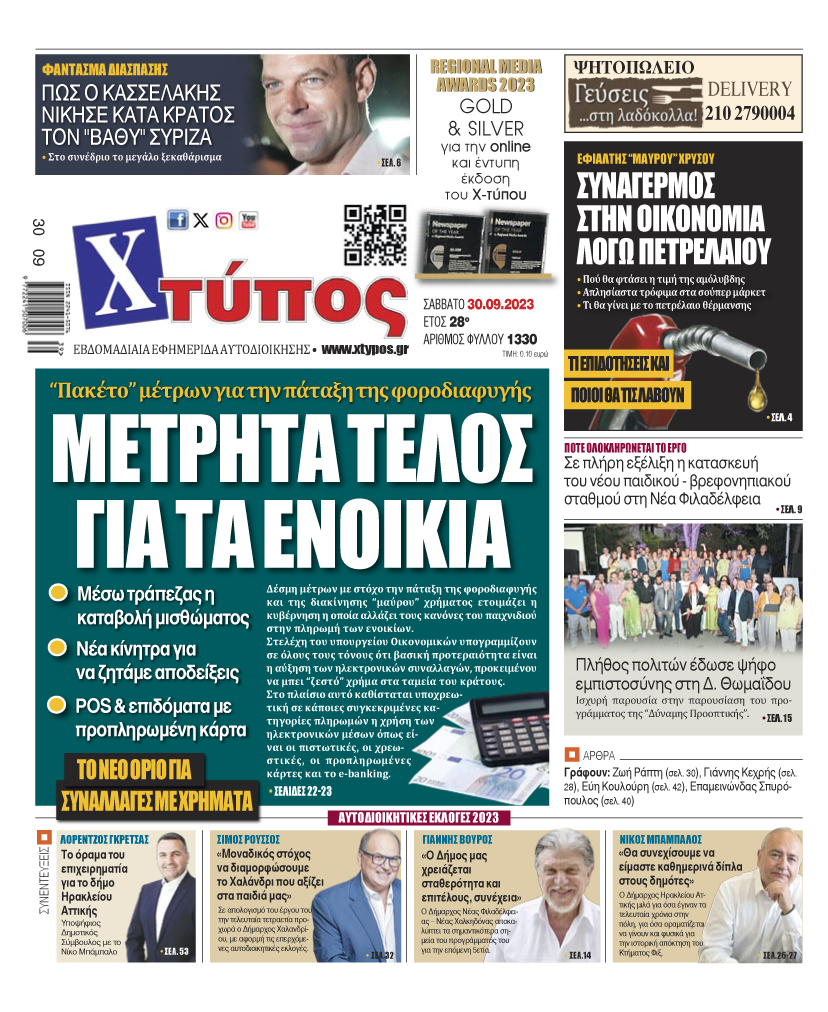 “Πρωτοσέλιδο της εφημερίδας «ΧΤΥΠΟΣ» Σάββατο 30 Σεπτεμβρίου 2023”