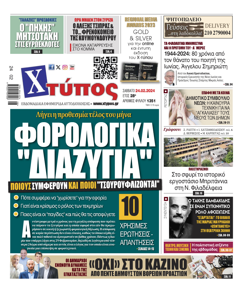 “Πρωτοσέλιδο της εφημερίδας «ΧΤΥΠΟΣ» Σάββατο 24 Φεβρουαρίου 2024”