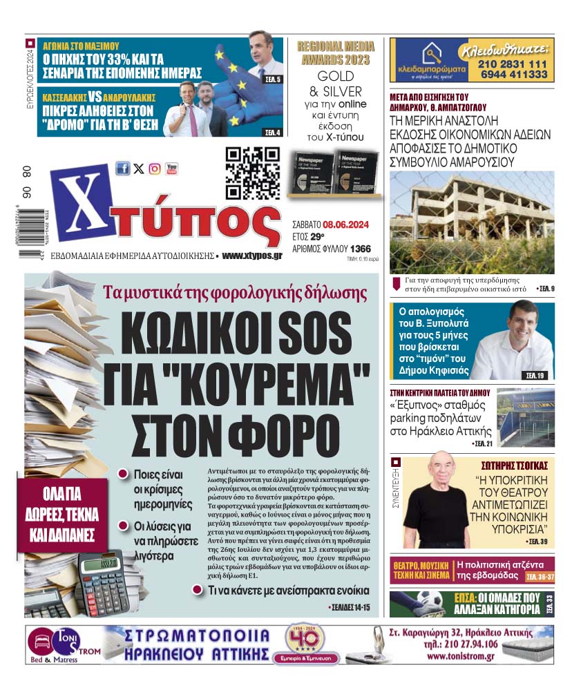 “Πρωτοσέλιδο της εφημερίδας «ΧΤΥΠΟΣ» Σάββατο 08 Ιουνίου 2024”