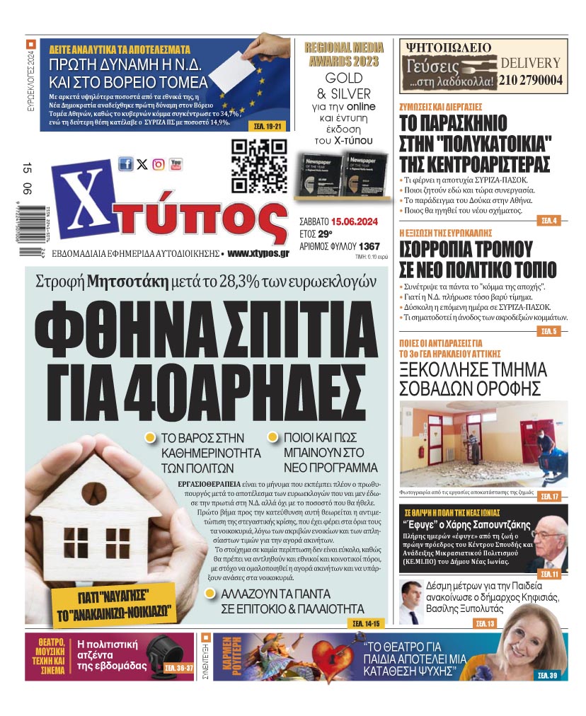 “Πρωτοσέλιδο της εφημερίδας «ΧΤΥΠΟΣ» Σάββατο 15 Ιουνίου 2024”