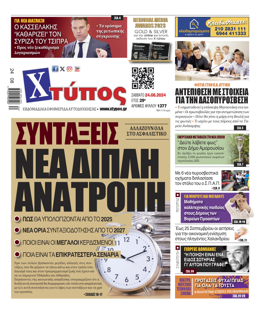 “Πρωτοσέλιδο της εφημερίδας «ΧΤΥΠΟΣ» Σάββατο 24 Αυγούστου 2024”