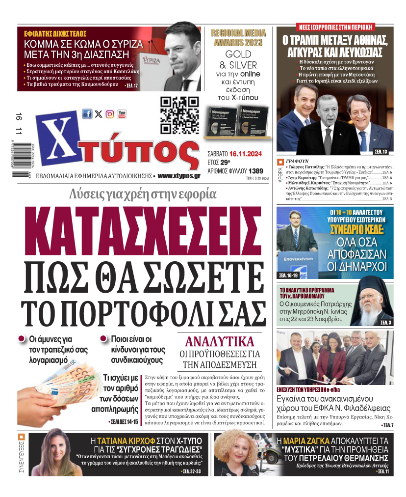 “Πρωτοσέλιδο της εφημερίδας «ΧΤΥΠΟΣ» Σάββατο 16 Νοεμβρίου 2024”