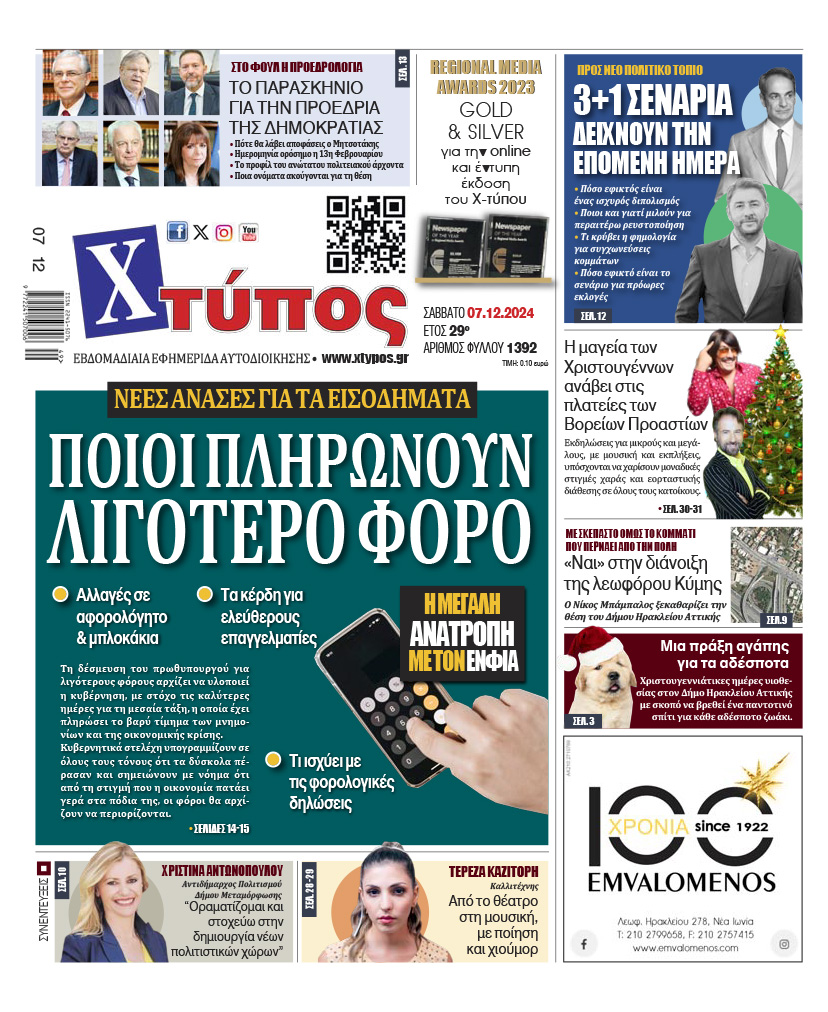 “Πρωτοσέλιδο της εφημερίδας «ΧΤΥΠΟΣ» Σάββατο 7 Δεκεμβρίου 2024”