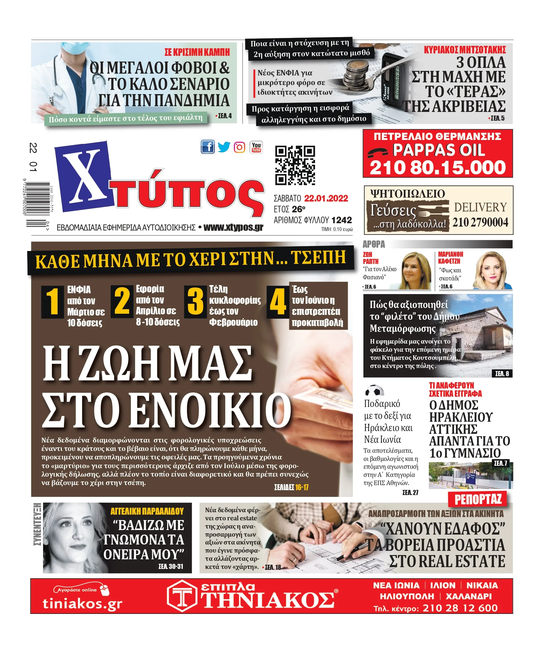 “Πρωτοσέλιδο εφημερίδας «ΧΤΥΠΟΣ» Σάββατο 22 Ιανουαρίου 2022”
