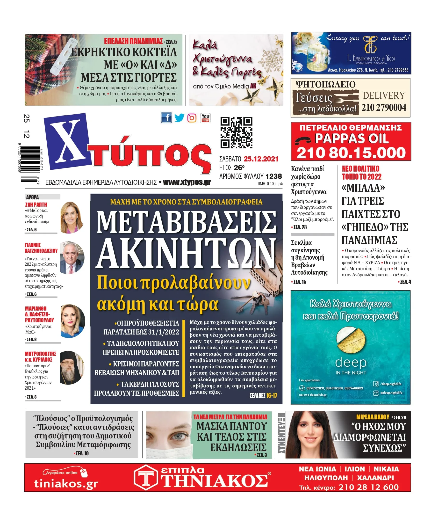 “Πρωτοσέλιδο εφημερίδας «ΧΤΥΠΟΣ» Σάββατο 25 Δεκεμβρίου 2021”