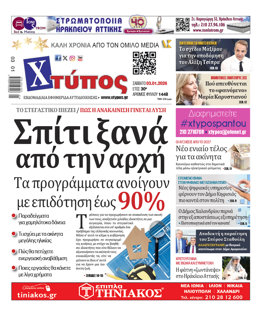 “Πρωτοσέλιδο της εφημερίδας «ΧΤΥΠΟΣ» Σάββατο 3 Ιανουαρίου 2026”