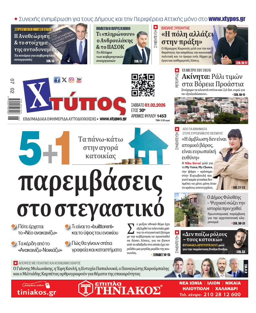 “Πρωτοσέλιδο της εφημερίδας «ΧΤΥΠΟΣ» Σάββατο 7 Φεβρουαρίου 2026” Δημοσιεύθηκε πριν από: 7 ημέρες 5 Φεβρουαρίου 2026 187 Κοινοποίηση FacebookTwitterPinterestTelegramWhatsAppViberΤυπώνωΗΛΕΚΤΡΟΝΙΚΗ ΔΙΕΥΘΥΝΣΗCopy URL Αποθήκευση δημοσίευσηςΑποθηκεύθηκε Κατεβάστε το ηλεκτρονικό φύλλο Ηλεκτρονική έκδοση εφημερίδας Χτύπος, Φύλλο 1453, 07/2/2026 ΠΡΟΣΦΑΤΑ ΠΡΩΤΟΣΕΛΙΔΑ “Πρωτοσέλιδο της εφημερίδας «ΧΤΥΠΟΣ» Σάββατο 31 Ιανουαρίου 2026” “Πρωτοσέλιδο της εφημερίδας «ΧΤΥΠΟΣ» Σάββατο 24 Ιανουαρίου 2026” “Πρωτοσέλιδο της εφημερίδας «ΧΤΥΠΟΣ» Σάββατο 17 Ιανουαρίου 2026” “Πρωτοσέλιδο της εφημερίδας «ΧΤΥΠΟΣ» Σάββατο 10 Ιανουαρίου 2026” “Πρωτοσέλιδο της εφημερίδας «ΧΤΥΠΟΣ» Σάββατο 3 Ιανουαρίου 2026” Φόρτωση περισσοτέρων Προηγούμενο άρθρο“Πρωτοσέλιδο της εφημερίδας «ΧΤΥΠΟΣ» Σάββατο 31 Ιανουαρίου 2026” ΠΡΟΣΦΑΤΑ ΑΡΘΡΑ Πολιτισμός ΕΡΩΦΙΛΗ του Γιώργου Χορτάτση κάθε Τετάρτη στο Θέατρο ΔΡΟΜΟΣ 12 Φεβρουαρίου 2026 Διονύσου Διακοπή νερού την Παρασκευή (13/2) στο Κρυονέρι και την οδό Ερυθραίας 12 Φεβρουαρίου 2026 Πεντέλης Δήμος Πεντέλης: Με επιτυχία η κοπή πίτας του Τμήματος Παιδείας και δωρεά απινιδωτών 12 Φεβρουαρίου 2026 Πεντέλης Δήμος Πεντέλης: Κοπή πίτας και βραβεύσεις στον Σύλλογο Ξιφασκίας «Λύγκας» Πεντέλης «Ανεξίτηλο»: Η θεατρική επιστροφή των RE-ACTORS στα Μελίσσια (14-15/2) Ειδήσεις ΚΕΔΕ: Αναθεώρηση Συντάγματος, νέος Κώδικας Τοπικής Αυτοδιοίκησης και λύση για ΔΕΥΑ Πολιτισμός Στη Στέγη η μεγαλύτερη έκθεση φωτογραφίας του Γιώργου Λάνθιμου με 182 έργα