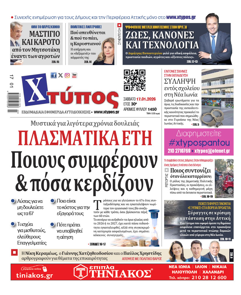 “Πρωτοσέλιδο της εφημερίδας «ΧΤΥΠΟΣ» Σάββατο 17 Ιανουαρίου 2026” Δημοσιεύθηκε πριν από: 4 εβδομάδες 16 Ιανουαρίου 2026 50 Κοινοποίηση FacebookTwitterPinterestTelegramWhatsAppViberΤυπώνωΗΛΕΚΤΡΟΝΙΚΗ ΔΙΕΥΘΥΝΣΗCopy URL Αποθήκευση δημοσίευσηςΑποθηκεύθηκε Κατεβάστε το ηλεκτρονικό φύλλο Ηλεκτρονική έκδοση εφημερίδας Χτύπος, Φύλλο 1450, 17/1/2026 ΠΡΟΣΦΑΤΑ ΠΡΩΤΟΣΕΛΙΔΑ “Πρωτοσέλιδο της εφημερίδας «ΧΤΥΠΟΣ» Σάββατο 7 Φεβρουαρίου 2026” “Πρωτοσέλιδο της εφημερίδας «ΧΤΥΠΟΣ» Σάββατο 31 Ιανουαρίου 2026” “Πρωτοσέλιδο της εφημερίδας «ΧΤΥΠΟΣ» Σάββατο 24 Ιανουαρίου 2026” “Πρωτοσέλιδο της εφημερίδας «ΧΤΥΠΟΣ» Σάββατο 10 Ιανουαρίου 2026” “Πρωτοσέλιδο της εφημερίδας «ΧΤΥΠΟΣ» Σάββατο 3 Ιανουαρίου 2026” Φόρτωση περισσοτέρων Προηγούμενο άρθρο“Πρωτοσέλιδο της εφημερίδας «ΧΤΥΠΟΣ» Σάββατο 10 Ιανουαρίου 2026”Επόμενο άρθρο“Πρωτοσέλιδο της εφημερίδας «ΧΤΥΠΟΣ» Σάββατο 24 Ιανουαρίου 2026” ΠΡΟΣΦΑΤΑ ΑΡΘΡΑ Πολιτισμός ΕΡΩΦΙΛΗ του Γιώργου Χορτάτση κάθε Τετάρτη στο Θέατρο ΔΡΟΜΟΣ 12 Φεβρουαρίου 2026 Διονύσου Διακοπή νερού την Παρασκευή (13/2) στο Κρυονέρι και την οδό Ερυθραίας 12 Φεβρουαρίου 2026 Πεντέλης Δήμος Πεντέλης: Με επιτυχία η κοπή πίτας του Τμήματος Παιδείας και δωρεά απινιδωτών 12 Φεβρουαρίου 2026 Πεντέλης Δήμος Πεντέλης: Κοπή πίτας και βραβεύσεις στον Σύλλογο Ξιφασκίας «Λύγκας» Πεντέλης «Ανεξίτηλο»: Η θεατρική επιστροφή των RE-ACTORS στα Μελίσσια (14-15/2) Ειδήσεις ΚΕΔΕ: Αναθεώρηση Συντάγματος, νέος Κώδικας Τοπικής Αυτοδιοίκησης και λύση για ΔΕΥΑ Πολιτισμός Στη Στέγη η μεγαλύτερη έκθεση φωτογραφίας του Γιώργου Λάνθιμου με 182 έργα
