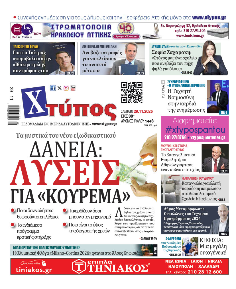 “Πρωτοσέλιδο της εφημερίδας «ΧΤΥΠΟΣ» Σάββατο 29 Νοεμβρίου 2025” Δημοσιεύθηκε πριν από: 3 μήνες 28 Νοεμβρίου 2025 33 Κοινοποίηση FacebookTwitterPinterestTelegramWhatsAppViberΤυπώνωΗΛΕΚΤΡΟΝΙΚΗ ΔΙΕΥΘΥΝΣΗCopy URL Αποθήκευση δημοσίευσηςΑποθηκεύθηκε Κατεβάστε το ηλεκτρονικό φύλλο Ηλεκτρονική έκδοση εφημερίδας Χτύπος, Φύλλο 1442, 29/11/2025 ΠΡΟΣΦΑΤΑ ΠΡΩΤΟΣΕΛΙΔΑ “Πρωτοσέλιδο της εφημερίδας «ΧΤΥΠΟΣ» Σάββατο 7 Φεβρουαρίου 2026” “Πρωτοσέλιδο της εφημερίδας «ΧΤΥΠΟΣ» Σάββατο 31 Ιανουαρίου 2026” “Πρωτοσέλιδο της εφημερίδας «ΧΤΥΠΟΣ» Σάββατο 24 Ιανουαρίου 2026” “Πρωτοσέλιδο της εφημερίδας «ΧΤΥΠΟΣ» Σάββατο 17 Ιανουαρίου 2026” “Πρωτοσέλιδο της εφημερίδας «ΧΤΥΠΟΣ» Σάββατο 10 Ιανουαρίου 2026” Φόρτωση περισσοτέρων Προηγούμενο άρθρο“Πρωτοσέλιδο της εφημερίδας «ΧΤΥΠΟΣ» Σάββατο 22 Νοεμβρίου 2025”Επόμενο άρθρο“Πρωτοσέλιδο της εφημερίδας «ΧΤΥΠΟΣ» Σάββατο 6 Δεκεμβρίου 2025” ΠΡΟΣΦΑΤΑ ΑΡΘΡΑ Πολιτισμός ΕΡΩΦΙΛΗ του Γιώργου Χορτάτση κάθε Τετάρτη στο Θέατρο ΔΡΟΜΟΣ 12 Φεβρουαρίου 2026 Διονύσου Διακοπή νερού την Παρασκευή (13/2) στο Κρυονέρι και την οδό Ερυθραίας 12 Φεβρουαρίου 2026 Πεντέλης Δήμος Πεντέλης: Με επιτυχία η κοπή πίτας του Τμήματος Παιδείας και δωρεά απινιδωτών 12 Φεβρουαρίου 2026 Πεντέλης Δήμος Πεντέλης: Κοπή πίτας και βραβεύσεις στον Σύλλογο Ξιφασκίας «Λύγκας» Πεντέλης «Ανεξίτηλο»: Η θεατρική επιστροφή των RE-ACTORS στα Μελίσσια (14-15/2) Ειδήσεις ΚΕΔΕ: Αναθεώρηση Συντάγματος, νέος Κώδικας Τοπικής Αυτοδιοίκησης και λύση για ΔΕΥΑ Πολιτισμός Στη Στέγη η μεγαλύτερη έκθεση φωτογραφίας του Γιώργου Λάνθιμου με 182 έργα