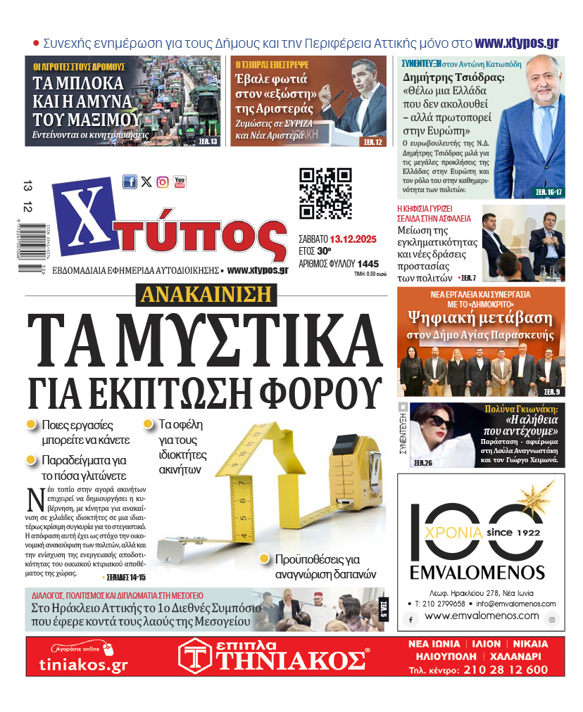 “Πρωτοσέλιδο της εφημερίδας «ΧΤΥΠΟΣ» Σάββατο 13 Δεκεμβρίου 2025” Δημοσιεύθηκε πριν από: 2 μήνες 12 Δεκεμβρίου 2025 42 Κοινοποίηση FacebookTwitterPinterestTelegramWhatsAppViberΤυπώνωΗΛΕΚΤΡΟΝΙΚΗ ΔΙΕΥΘΥΝΣΗCopy URL Αποθήκευση δημοσίευσηςΑποθηκεύθηκε Κατεβάστε το ηλεκτρονικό φύλλο Ηλεκτρονική έκδοση εφημερίδας Χτύπος, Φύλλο 1445, 13/12/2025 ΠΡΟΣΦΑΤΑ ΠΡΩΤΟΣΕΛΙΔΑ “Πρωτοσέλιδο της εφημερίδας «ΧΤΥΠΟΣ» Σάββατο 7 Φεβρουαρίου 2026” “Πρωτοσέλιδο της εφημερίδας «ΧΤΥΠΟΣ» Σάββατο 31 Ιανουαρίου 2026” “Πρωτοσέλιδο της εφημερίδας «ΧΤΥΠΟΣ» Σάββατο 24 Ιανουαρίου 2026” “Πρωτοσέλιδο της εφημερίδας «ΧΤΥΠΟΣ» Σάββατο 17 Ιανουαρίου 2026” “Πρωτοσέλιδο της εφημερίδας «ΧΤΥΠΟΣ» Σάββατο 10 Ιανουαρίου 2026” Φόρτωση περισσοτέρων Προηγούμενο άρθρο“Πρωτοσέλιδο της εφημερίδας «ΧΤΥΠΟΣ» Σάββατο 6 Δεκεμβρίου 2025”Επόμενο άρθρο“Πρωτοσέλιδο της εφημερίδας «ΧΤΥΠΟΣ» Σάββατο 20 Δεκεμβρίου 2025” ΠΡΟΣΦΑΤΑ ΑΡΘΡΑ Πολιτισμός ΕΡΩΦΙΛΗ του Γιώργου Χορτάτση κάθε Τετάρτη στο Θέατρο ΔΡΟΜΟΣ 12 Φεβρουαρίου 2026 Διονύσου Διακοπή νερού την Παρασκευή (13/2) στο Κρυονέρι και την οδό Ερυθραίας 12 Φεβρουαρίου 2026 Πεντέλης Δήμος Πεντέλης: Με επιτυχία η κοπή πίτας του Τμήματος Παιδείας και δωρεά απινιδωτών 12 Φεβρουαρίου 2026 Πεντέλης Δήμος Πεντέλης: Κοπή πίτας και βραβεύσεις στον Σύλλογο Ξιφασκίας «Λύγκας» Πεντέλης «Ανεξίτηλο»: Η θεατρική επιστροφή των RE-ACTORS στα Μελίσσια (14-15/2) Ειδήσεις ΚΕΔΕ: Αναθεώρηση Συντάγματος, νέος Κώδικας Τοπικής Αυτοδιοίκησης και λύση για ΔΕΥΑ Πολιτισμός Στη Στέγη η μεγαλύτερη έκθεση φωτογραφίας του Γιώργου Λάνθιμου με 182 έργα