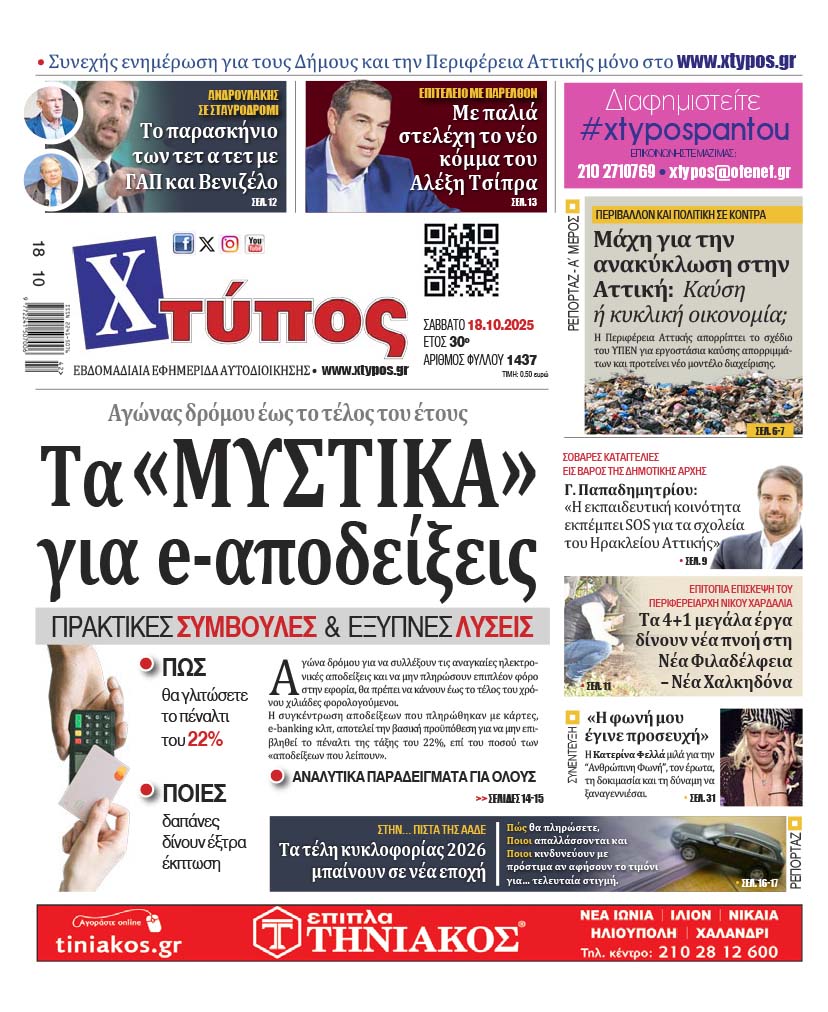 “Πρωτοσέλιδο της εφημερίδας «ΧΤΥΠΟΣ» Σάββατο 18 Οκτωβρίου 2025” Δημοσιεύθηκε πριν από: 4 μήνες 16 Οκτωβρίου 2025 42 Κοινοποίηση FacebookTwitterPinterestTelegramWhatsAppViberΤυπώνωΗΛΕΚΤΡΟΝΙΚΗ ΔΙΕΥΘΥΝΣΗCopy URL Αποθήκευση δημοσίευσηςΑποθηκεύθηκε Κατεβάστε το ηλεκτρονικό φύλλο Ηλεκτρονική έκδοση εφημερίδας Χτύπος, Φύλλο 1437, 18/10/2025 ΠΡΟΣΦΑΤΑ ΠΡΩΤΟΣΕΛΙΔΑ “Πρωτοσέλιδο της εφημερίδας «ΧΤΥΠΟΣ» Σάββατο 14 Φεβρουαρίου 2026” “Πρωτοσέλιδο της εφημερίδας «ΧΤΥΠΟΣ» Σάββατο 7 Φεβρουαρίου 2026” “Πρωτοσέλιδο της εφημερίδας «ΧΤΥΠΟΣ» Σάββατο 31 Ιανουαρίου 2026” “Πρωτοσέλιδο της εφημερίδας «ΧΤΥΠΟΣ» Σάββατο 24 Ιανουαρίου 2026” “Πρωτοσέλιδο της εφημερίδας «ΧΤΥΠΟΣ» Σάββατο 17 Ιανουαρίου 2026” Φόρτωση περισσοτέρων Προηγούμενο άρθρο“Πρωτοσέλιδο της εφημερίδας «ΧΤΥΠΟΣ» Σάββατο 11 Οκτωβρίου 2025”Επόμενο άρθρο“Πρωτοσέλιδο της εφημερίδας «ΧΤΥΠΟΣ» Σάββατο 25 Οκτωβρίου 2025” ΠΡΟΣΦΑΤΑ ΑΡΘΡΑ Οικονομία Συντάξεις Μαρτίου 2026: Νωρίτερα οι πληρωμές λόγω Καθαράς Δευτέρας 13 Φεβρουαρίου 2026 Ηρακλείου Αττικής Συνεδριάζει το Δημοτικό Συμβούλιο Ηρακλείου Αττικής στις 18/2: Τα 21 θέματα της ατζέντας 13 Φεβρουαρίου 2026 Παιδεία Απουσίες σε Γυμνάσια και Λύκεια: Πώς δικαιολογούνται και ποια είναι τα όρια φοίτησης 13 Φεβρουαρίου 2026 Εργασία Δώρο Πάσχα 2026: Πότε πληρώνεται και πώς υπολογίζεται για τους εργαζόμενους Οικονομία Άρειος Πάγος: Αναδρομικός ανατοκισμός στα δάνεια Κατσέλη μόνο στη μηνιαία δόση Κόσμος Ρωσική επίθεση με drones στην Οδησσό: Ένας νεκρός, έξι τραυματίες Κοινωνία Λυκόβρυση – Πεύκη: Κούλουμα για παιδιά στο Κτήμα Τζερμιά (15/2)