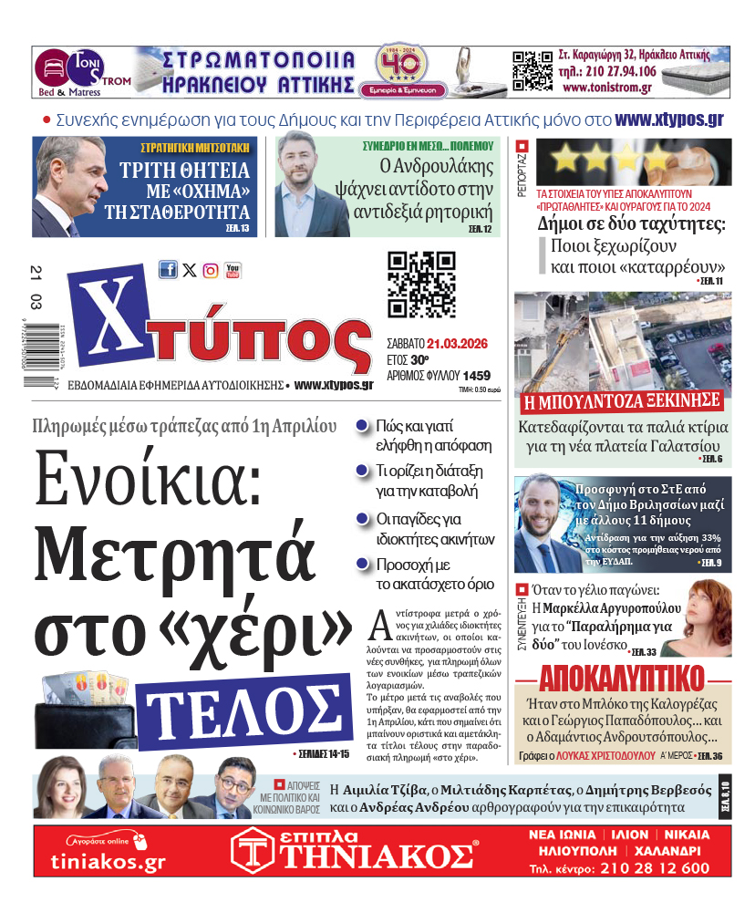 “Πρωτοσέλιδο της εφημερίδας «ΧΤΥΠΟΣ» Σάββατο 21 Μαρτίου 2026”