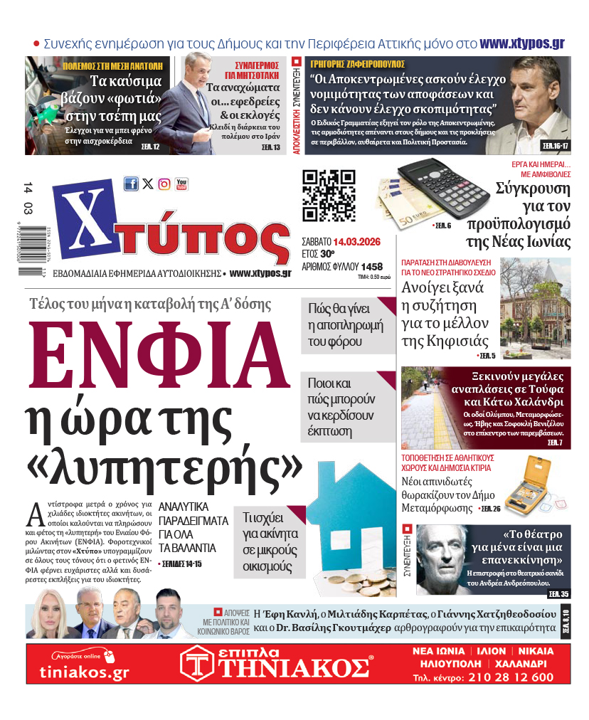 “Πρωτοσέλιδο της εφημερίδας «ΧΤΥΠΟΣ» Σάββατο 14 Μαρτίου 2026” Δημοσιεύθηκε πριν από: 5 ώρες 13 Μαρτίου 2026 36 Κοινοποίηση FacebookTwitterPinterestTelegramWhatsAppViberΤυπώνωΗΛΕΚΤΡΟΝΙΚΗ ΔΙΕΥΘΥΝΣΗCopy URL Αποθήκευση δημοσίευσηςΑποθηκεύθηκε Κατεβάστε το ηλεκτρονικό φύλλο Ηλεκτρονική έκδοση εφημερίδας Χτύπος, Φύλλο 1458, 14/3/2026 ΠΡΟΣΦΑΤΑ ΠΡΩΤΟΣΕΛΙΔΑ “Πρωτοσέλιδο της εφημερίδας «ΧΤΥΠΟΣ» Σάββατο 7 Μαρτίου 2026” “Πρωτοσέλιδο της εφημερίδας «ΧΤΥΠΟΣ» Σάββατο 28 Φεβρουαρίου 2026” “Πρωτοσέλιδο της εφημερίδας «ΧΤΥΠΟΣ» Σάββατο 21 Φεβρουαρίου 2026” “Πρωτοσέλιδο της εφημερίδας «ΧΤΥΠΟΣ» Σάββατο 14 Φεβρουαρίου 2026” “Πρωτοσέλιδο της εφημερίδας «ΧΤΥΠΟΣ» Σάββατο 7 Φεβρουαρίου 2026” Φόρτωση περισσοτέρων Προηγούμενο άρθρο“Πρωτοσέλιδο της εφημερίδας «ΧΤΥΠΟΣ» Σάββατο 7 Μαρτίου 2026” ΠΡΟΣΦΑΤΑ ΑΡΘΡΑ Παπάγου - Χολαργού Παπάγου – Χολαργός: Μεγάλη συναυλία με τραγούδια του ελληνικού κινηματογράφου την Κυριακή 15 Μαρτίου 13 Μαρτίου 2026 Πολιτισμός Δωρεάν είσοδος σε μουσεία και αρχαιολογικούς χώρους την Κυριακή 15 Μαρτίου 13 Μαρτίου 2026 Αμαρουσίου Δήμος Αμαρουσίου: Επίσκεψη μαθητών στο Δημαρχείο για το μάθημα Κοινωνικής και Πολιτικής Αγωγής 13 Μαρτίου 2026 Οικονομία Λιανεμπόριο: Αύξηση 6,1% στον τζίρο το πρώτο δίμηνο του 2026 Κοινωνία Συμβουλευτικό Κέντρο Γυναικών Χαλανδρίου: Νέες δράσεις ενδυνάμωσης και πρόγραμμα για μαθητές Πολιτισμός Δήμος Χαλανδρίου: Μουσικό αφιέρωμα για τα 200 χρόνια από την Έξοδο του Μεσολογγίου Παιδεία ΕΣΥ: Έρχονται 850 μόνιμες προσλήψεις γιατρών στα δημόσια νοσοκομεία
