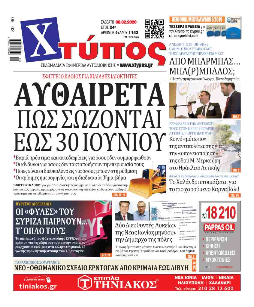 Πρωτοσέλιδο «ΧΤΥΠΟΣ» Σάββατο 8 Φεβρουαρίου 2020