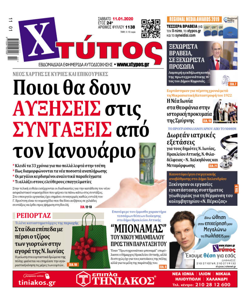 Πρωτοσέλιδο «ΧΤΥΠΟΣ» Σάββατο 11 Ιανουαρίου 2020