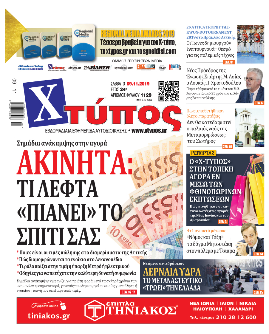 Πρωτοσέλιδο «ΧΤΥΠΟΣ» Σάββατο 16 Νοεμβρίου 2019