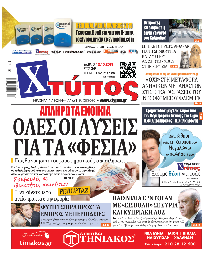 Πρωτοσέλιδο «ΧΤΥΠΟΣ» Σάββατο 12 Οκτωβρίου 2019