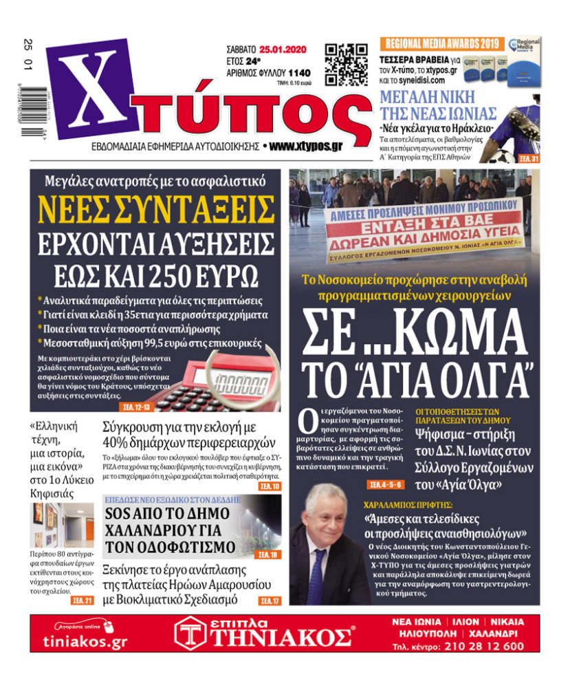 Πρωτοσέλιδο «ΧΤΥΠΟΣ» Σάββατο 25 Ιανουαρίου 2020